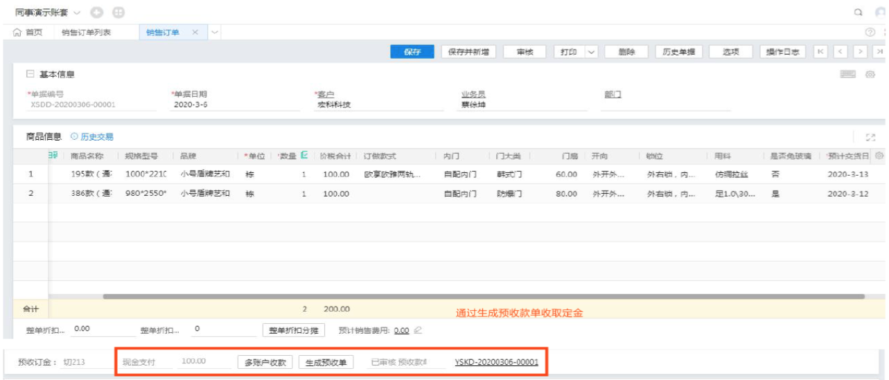(2)在做銷售訂單同時可生成預收款單,用以記錄收取的定金;