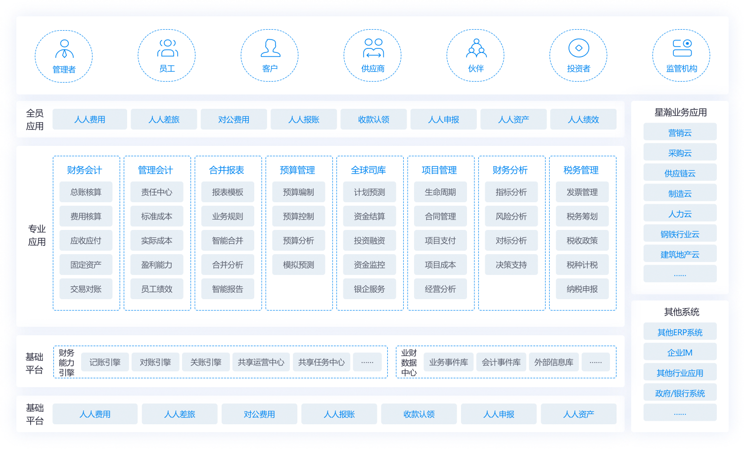 金蝶云·星瀚是大型企業(yè)EBC,其中財務云是首要核心能力,能幫助大企業(yè)對標世界一流,打造財務管理新世界。秉承事件驅動會計、共生增值、實時全球全息財務等新理念,立足數(shù)字員工、可組裝的會計引擎、高級分析等新技術,助力大企業(yè)從財務共享到財務中臺,構建新一代EPM、全球司庫、智慧稅務等應用,重構財務數(shù)字戰(zhàn)斗力